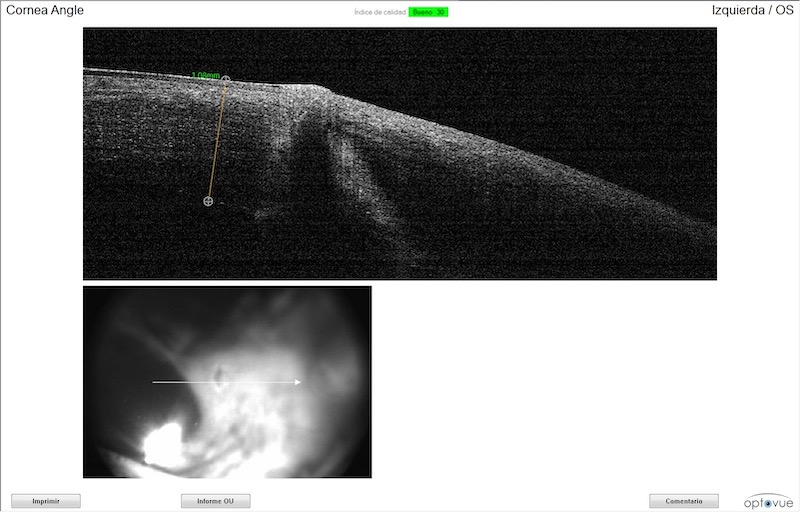 En el caso de Lya, para confirmar la sospecha de cuerpo extraño se le realizaron una ecografía oftalmológica (UVM) y una OCT de córnea.